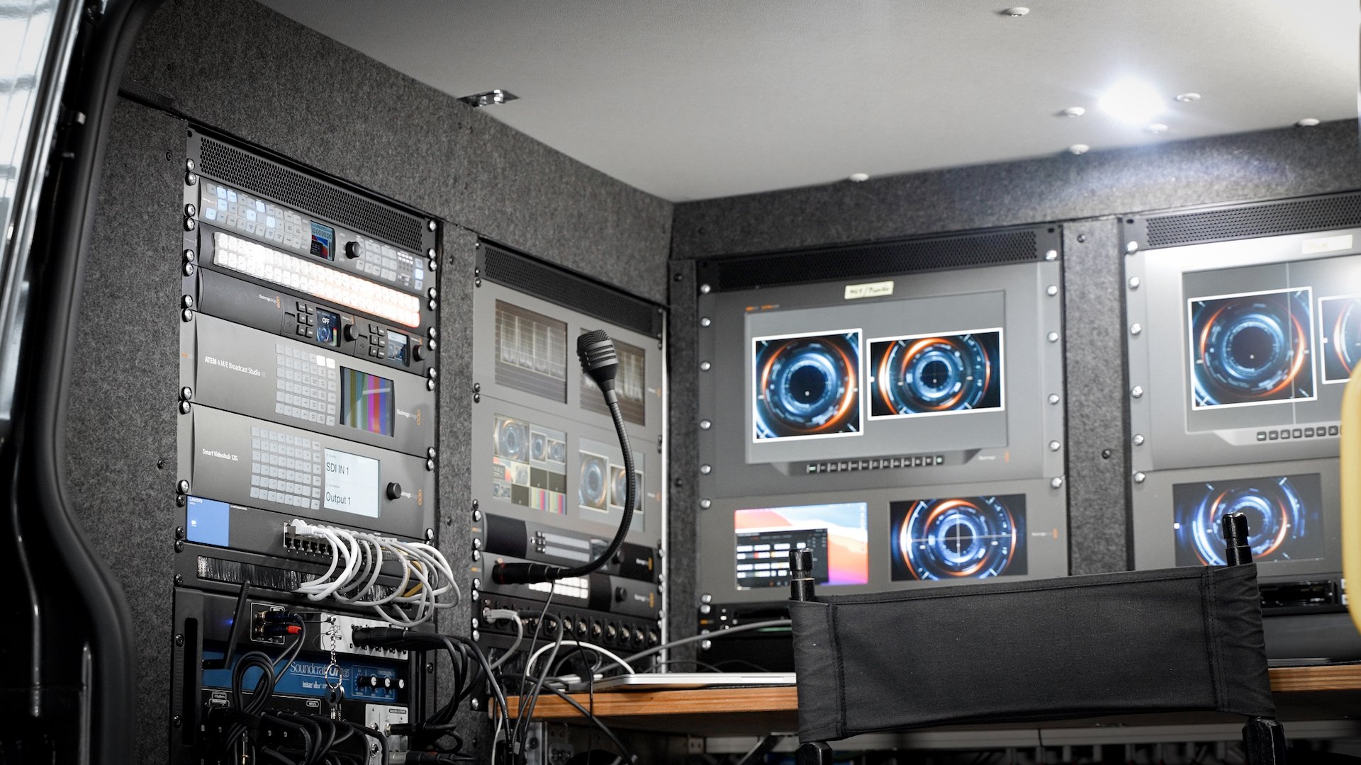 All inputs and outputs run via patch panels and a Smart Videohub 12G router, making it possible to distribute lines from outside the set or from the van to video walls or other OB vans, including editorial OB vans, as needed.