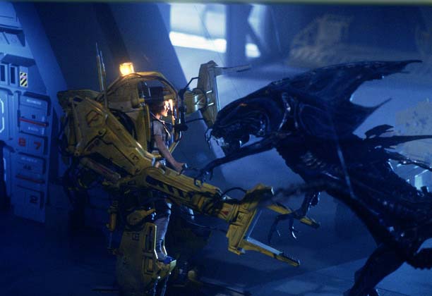 The yellow of Ripley's Powerloader against blue lighting in Aliens, creates colour contrast.